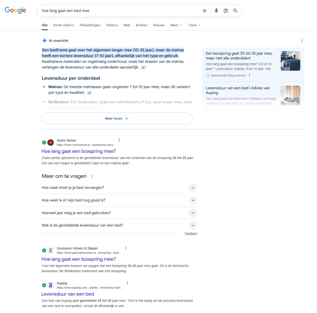 - Hoe Google zelf antwoorden geeft (via AI-snippets en People Also Ask).