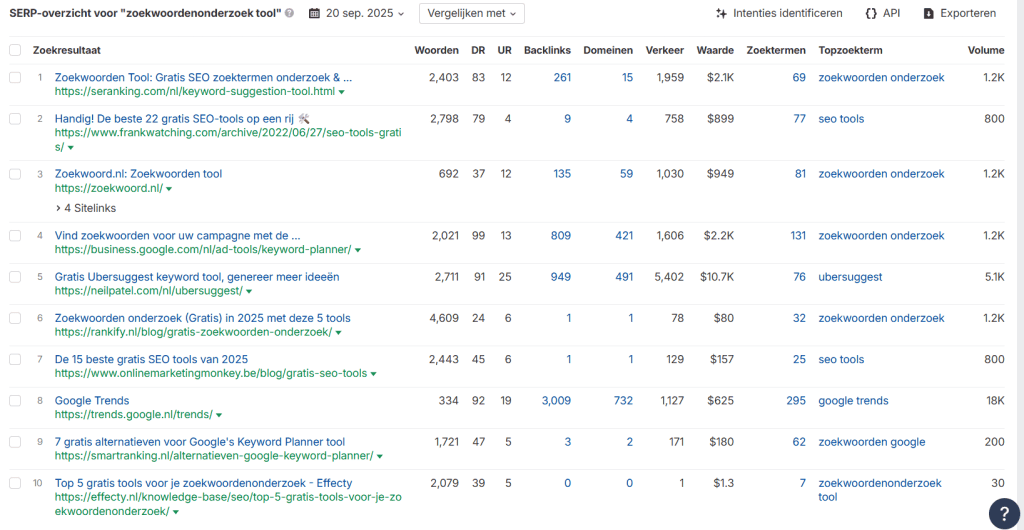 Kijk welke sites nu scoren op jouw beoogde zoekwoorden. Welke contentstructuur gebruiken ze? Zijn er kansen om het beter te doen – vollediger, actueler of met meer praktijkvoorbeelden?